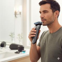 ماكينة حلاقة تمنحك حلاقة مثالية للاستخدام الرطب والجاف مع قاعدة شحن، وحقيبة سفر صلبة، وكابل شحن USB-A لشحن مريح أثناء التنقل، بالإضافة إلى محول طاقة.