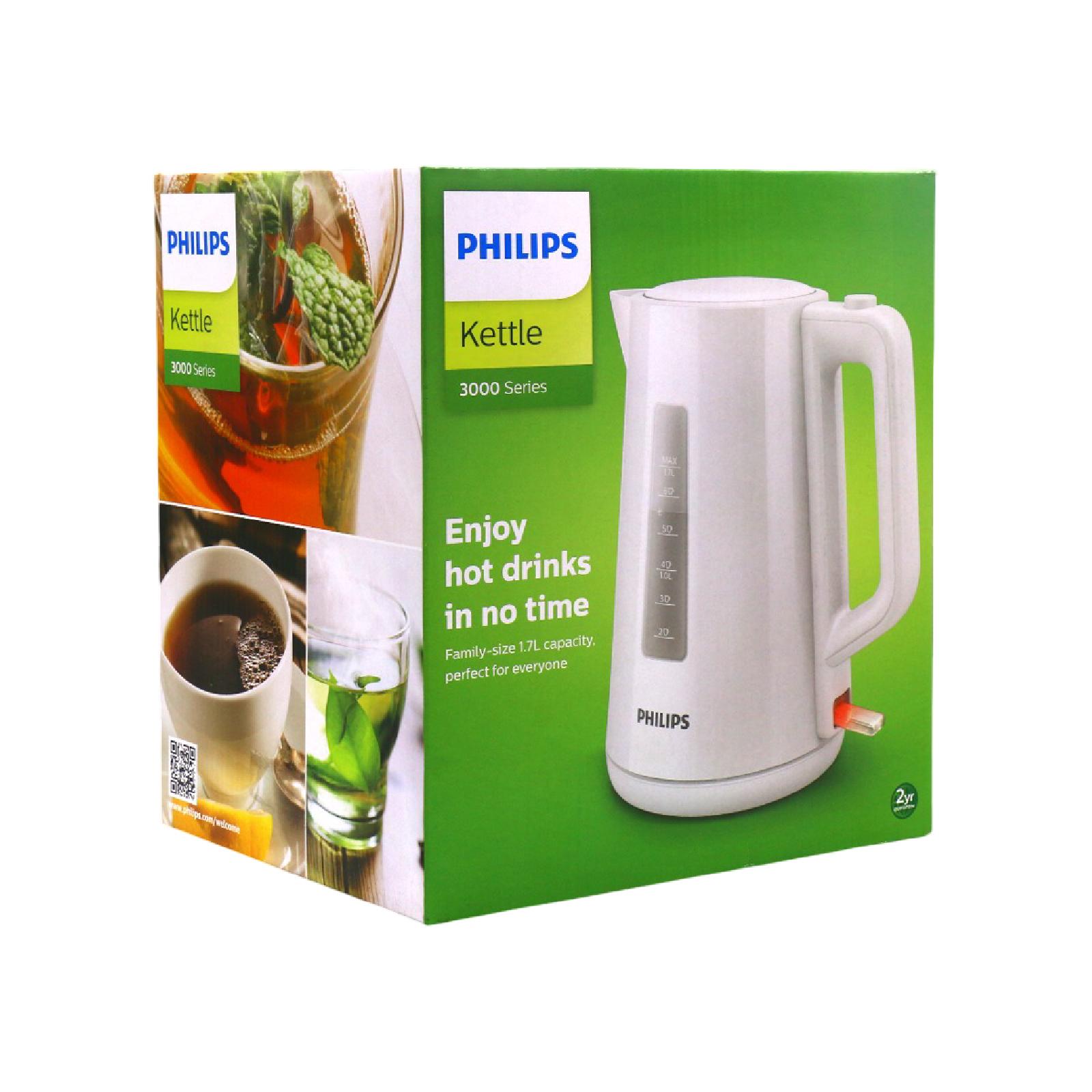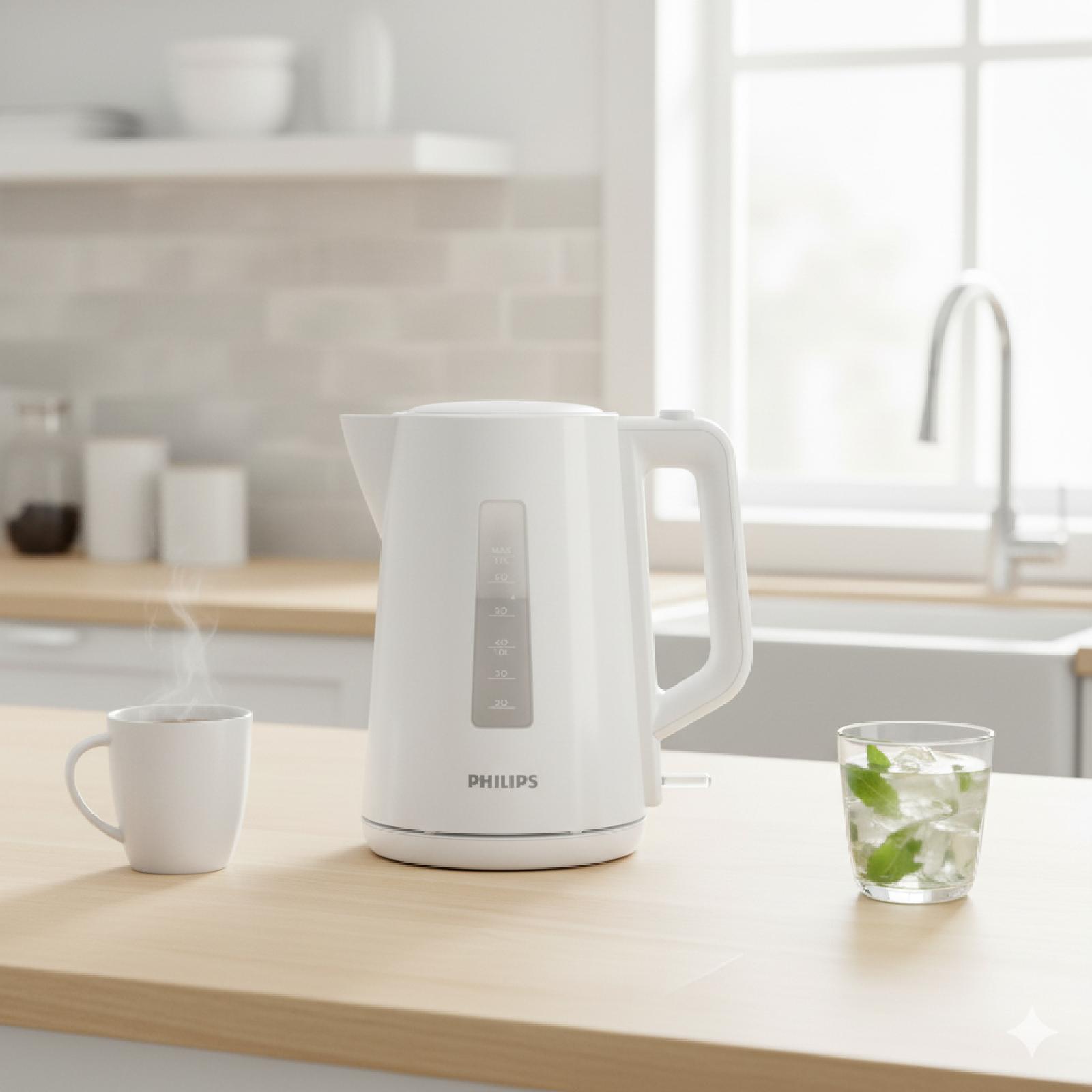 غلاية فيليبس البيضاء الأنيقة تسخن الماء حتى الغليان في لحظة تتمتع الغلاية بقوة 2200 واط، لذا فإن عنصر التسخين الفعال يغلي الماء بسرعة.